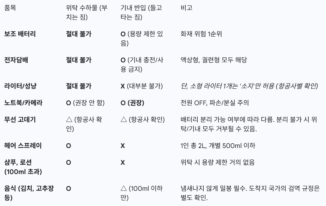 가치 있는 것 (Value): 노트북, 카메라, 현금, 중요 서류, 의약품 등은 분실/파손 위험이 있으니 반드시 기내 반입 하세요. 위험한 것 (Hazard): 보조 배터리, 전자담배 등은 화재 감시가 가능한 기내 반입만 허용됩니다.출발 전 항공사 규정 재확인